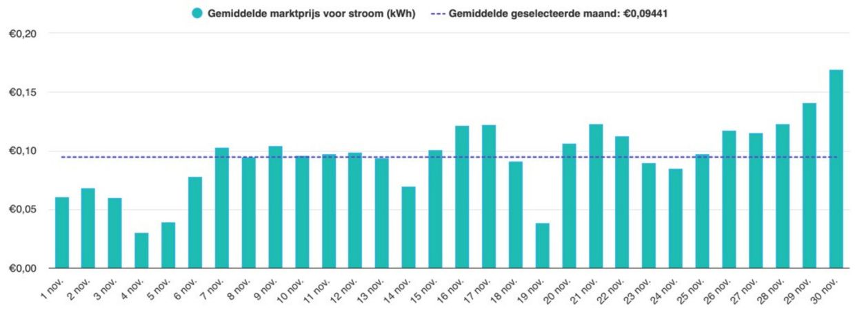 U sluit in november een dynamisch contract af. Soms betaalt u €0,05 per kWh, soms €0,20. Gemiddeld komt u die maand uit op €0,09, vaak lager dan de vaste prijs van dat moment.