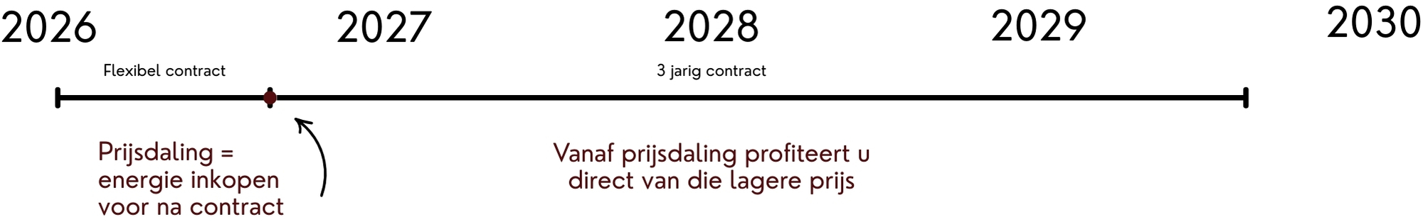 Een sluit een dynamisch contract af. In april zakt de markt flink. Wij kopen dan direct in voor bv 2027 t/m 2029 tegen een scherp tarief. U stapt vrijwel direct over naar die vaste prijs, precies op het juiste moment.