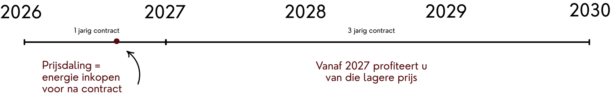 U sluit een jaarcontract af voor 2026. Zakt de markt dat jaar? Dan kopen wij alvast in voor 2027 en verder. Zo profiteert u na uw contract automatisch van de lage prijs voor een langere tijd.